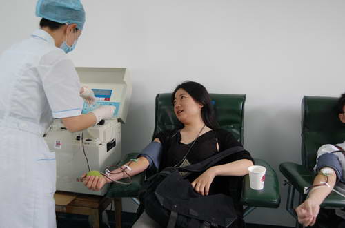 5月18日,成都市血液中心的采血室迎来了一位特殊的献血者,她就是中央电视台新闻中心第一批专机前往四川采访的前线记者隋笑梅。