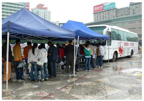8点30分,由体采科、成分科、后勤科等科室工作人员组成的应急采血队,分乘三辆采血车从血站出发,前往文化广场、火车站广场等应急采血点迅速展开工作。车刚停稳,就有很多热心市民前来咨询并积极参与献血,绵阳市义工联合会无偿献血宣传队的4名志愿者和临时招募的近20名无偿献血志愿者,经过简单的培训后,立即加入到各应急采血点进行献血宣传和服务工作。体采科职工计伟、刘贵清的家乡均是此次地震的重灾区,她们怀着对家乡亲人的思念始终坚守在采血工作岗位上,这种识大体、顾大局的精神感染了采血队的所有工作人员。三个应急采血队在负责人的带领下,忘我的工作在采血现场,从上午8点30分到下午7点,市民争先涌跃献血,截止下午7点,三个应急采血点共有317人参加献血,献血量达74100ml。