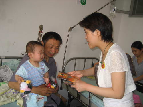 6月3日下午,血液中心工会副主席张杰、行政支部书记周健和业务二支部支委高加良,团总支书记刘飞以及志愿者等10余人,来到成都市儿童医院,慰问来自什邡、棉竹等在“5•12”地震中受伤的儿童,向他们的父母了解孩子的病情,为每个孩子送去儿童书籍、学习用品和玩具,安慰他们在这里安心治疗,祝他们早日康复。孩子和他们的父母说政府和医院对我们太好了,今天血液中心又来慰问,送来慰问品,我们太感谢你们了!