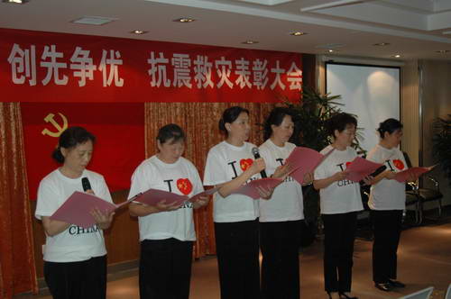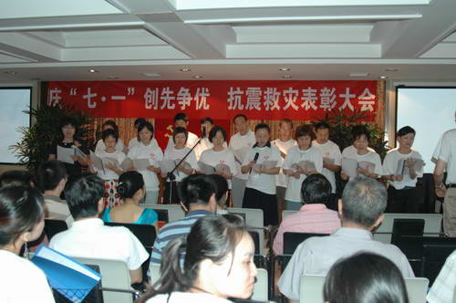 2008年6月30日下午,血液中心党委在新竣工的业务大楼学术厅,召开了“庆‘七、一’创先争优、抗震救灾表彰大会”,中心全体党员和职工代表参加了会议。