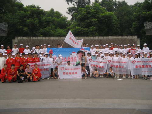 7月13日,成都市无偿献血宣传服务队在人民公园广场举行了暑期活动启动仪式。成都市血液中心党委书记尹丹妮、团市委志工部副部长宁可和成都信息工程学院团委书记丁云等出席了仪式。尹丹妮书记讲话高度评价了志愿者在无偿献血工作中的成绩和在抗震救灾中发挥的积极作用,希望大家再接再励、进一步作好工作。宁可部长宣布活动启动。