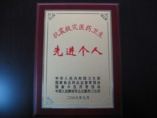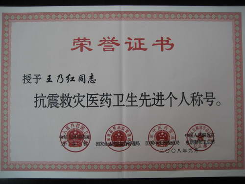 中心主任王乃红在9月25日由卫生部、国家食品药品监督管理局、国家中医药管理局、总后勤部卫生部联合召开的抗震救灾医药卫生先进集体和先进个人表彰工作电视电话会议上,荣获抗震救灾医药卫生先进个人称号。
