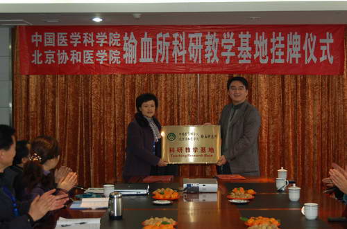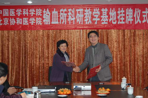 为加快科学技术进步,增强发展动力和技术创新能力,促进科研与临床输血相结合,实现优势互补,更好地为病人服务,成都市血液中心与中国医学科学院输血研究所 . 北京协和医学院达成共建科研教学基地的合作共识。2008年12月17日,合作协议的签字和揭牌仪式在成都市血液中心隆重举行。在友好合作的气氛中,血液中心主任王乃红和中国医学科学院输血研究所 . 北京协和医学院所长郑忠伟在协议书上签字,并为科研教学基地揭牌,接着双方就合作具体事宜进行了进一步讨论。血液中心副主任杨群身主持会议,中心血液研究室科研人员、中国医学科学院输血研究所 . 北京协和医学院党委书记肖小璞、副所长刘嘉馨、输血安全首席专家王憬惺等参加会议。
