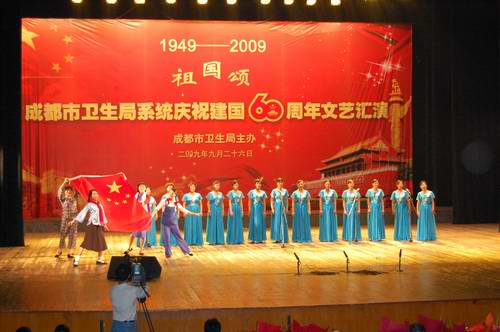 9月26日下午,成都市卫生局在锦城艺术宫举行了庆祝建国60周年“祖国颂歌”文艺汇演。成都市血液中心选送的女声表演唱《红梅赞》、《锈红旗》以其柔情而悠美的歌声和满怀深情的表演,换醒了人们对革命先烈的回忆和赞颂,赢得了评委和观众的掌声,最终获得文艺汇演二等奖。