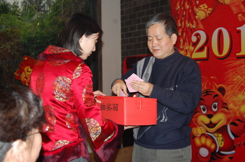 接下来业务一支部为大家带来了一曲大合唱《新年好》,向全体职工表达了新年的祝福。离退休支部的女声表演唱 《大中国》,唱出了大家共同对祖国的祝福。业务三支部带了一曲英文歌曲《我发誓》,业务二支部检验科的同志合唱了小虎队的经典歌曲《爱》,业务一支部陈斌独唱歌曲《等待》,业务三支部大合唱《隐形的翅膀》都赢得了阵阵掌声。业务一支部罗涛表演的舞蹈《璇子》以其优美的舞姿也赢得了喝彩声,业务二支部小品《上错花轿》更是以其统一的服装、有创意的故事构架成为团拜会中赢得人气最高的节目,引的大家笑声、掌声不断。最后,团拜会在行政支部合唱了一曲《恭喜 恭喜》和后勤支部大合唱《团结就是力量》中落下了帷幕。在节目中,还穿插了抽奖,由中心领导轮流为大家抽奖,每个职工都能获得了各种奖品。联欢会自始至终充满欢笑、喜气,在笑声中、掌声中,在发自心底的快乐中度过。