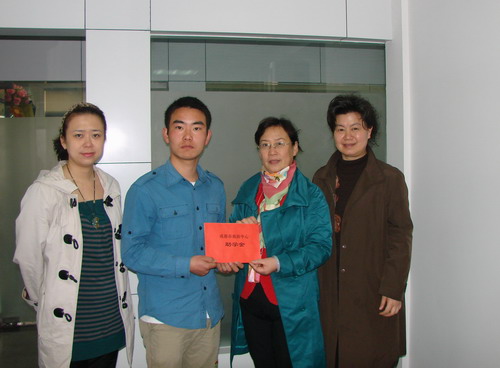 4月9日,中心副主任唐莉和党办、工会的工作人员一道把带着爱心的1000元助学金交给了家庭贫困、母亲患有重病,但刻苦学习、成绩优异的成都市无偿献血宣传服务分队队员、成都电子机械高等专科学校信息与计算科学系08731班学生欧德伟。欧德伟同学表示,要用更加优异的学习成绩和更多、更好的志愿服务来回报血液中心对自己的关心和爱护。