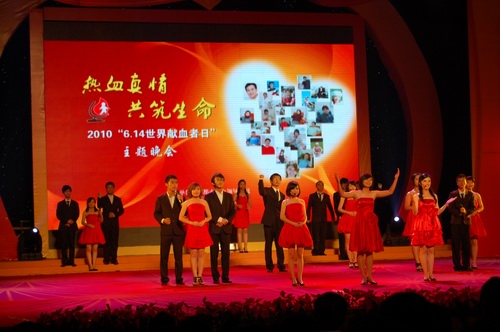 在一群志愿者富有感情的诗朗诵中,晚会拉开了序幕。2010年成都市无偿献血爱心大使、成都市电视台著名节目主持人张毅、李丹、袁莉合着他们拍摄的无偿献血公益广告走上了舞台,担任这台晚会的主持。傅勇林副市长在一片热烈的掌声中上台,代表市委、市政府、市献血领导小组,向全市为拯救生命自愿献出鲜血的无偿献血者致以节日的问候,向为我市无偿献血事业作出积极贡献的志愿者、社会爱心人士以及辛勤工作在第一线的血液工作者表示衷心感谢,并号召更多市民加入到无偿献血队伍中来,继续传递爱的火炬,为人间洒满爱的光辉。整台晚会以诗歌、纪录片等形式回顾了成都市无偿献血事业走过的历程,通过原创歌曲、舞蹈、朗诵等形式,充分展现了无偿献血个人和团队的风采。其中由志愿者创作的感谢无偿献血者的公益主题歌《红色的使命》和由成都市血液中心原创的展现血液工作者的诗歌朗诵更是将晚会推向了高潮,赢得了阵阵掌声。在晚会中,主持人还向大家介绍了成都市15位杰出的无偿献血者以及无偿献血先进团队的先进事迹,并请他们上台接收了献花。晚会在《欢庆》的大型舞蹈中落下了帷幕,无偿献血者、志愿者、血液工作者们齐聚一堂,让热血真情,共筑生命。