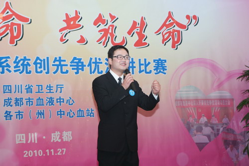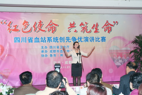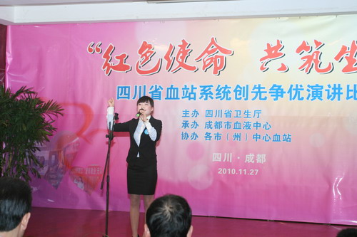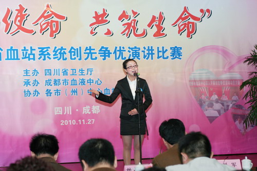 为深入贯彻落实《中央组织部、中央宣传部关于在党的基层组织和党员中深入开展创先争优活动的意见》及5月26日四川省医药卫生系统创先争优活动电视电话会议精神,由四川省卫生厅主办,成都市血液中心承办、各市(州)血站协办的全省血站系统 “红色使命,共筑生命”为主题的创先争优演讲比赛于11月27日在成都隆重举行。