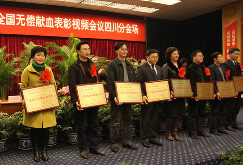 在卫生部、中国红十字总会、解放军总后勤部卫生部召开的2008―2009年度全国无偿献血表彰会议上,成都市再一次获得全国无偿献血先进城市奖,这是我市连续6年三届荣获该奖项,同时成都市分别有107人、23人和36人获得无偿献血奉献金、银、铜牌奖。此次无偿献血表彰,四川省首次荣获无偿献血先进省殊荣,218人获无偿献血奉献奖金奖,127人获无偿献血奉献奖银奖,667人获无偿献血奉献奖铜奖,11人获无偿献血造血干细胞奉献奖,四川宜宾五粮液集团有限公司、四川南格尔生物医学股份有限公司医用器具分公司、四川大学、西南科技大学、成都市血液中心5个单位获无偿献血促进奖。