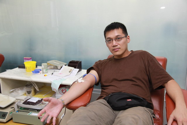 今天(七月四日)下午2点左右,血液中心机采室来了一位青年,拖着一个很大的旅行箱,背着大旅行包,在献血者中显得非常醒目。经过询问,才知道他是台湾同胞,在台湾是固定献血志愿者,已经在台湾献过300多次机采血小板(注:台湾机采血小板献血间隔为2周,全血献血间隔3个月),因工作原因已经在大陆生活一年多的时间了,他按照按大陆的献血最少间歇期限,在不同的城市多次献全血和血小板。最近刚到了成都,经多方打听献血地点,今天就拖着行李找到了中心,由于时间关系,他选择了献全血400ml,而且还表示,以后有机会再到成都会安排时间来捐献血小板。对于他的爱心和无私奉献精神,令在场的工作人员和献血者动容,也深深体会到两岸同胞血浓于水的骨肉亲情!