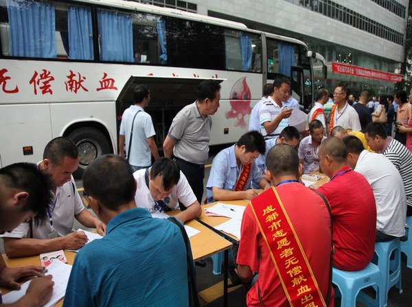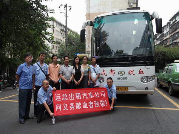 为充分展现成都市出租汽车行业无私奉献、积极向上的精神风貌,2011年8月3日,经成都市出租汽车协会组织发起、在成都市血液中心的大力配合下,成都市出租汽车无偿献血志愿宣传服务队的100多名队员在协会执行副会长张秉渝、办公室副主任熊景的带领下,来到血液中心开展“无偿献血奉献爱心、做有社会责任感的的士人”大型无偿献血宣传活动,这是继去年5月成都市出租汽车无偿献血志愿宣传服务队成立后的第三次团体无偿献血活动。
