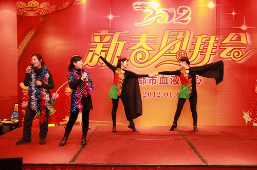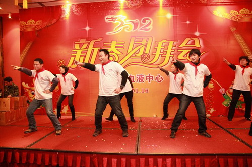 在表演之中,穿插对过去8年中参与无偿献血和过去1年中参与志愿服务的职工进行了表彰, 按照老传统,龙年出生的职工又闪亮登场,中心领导向“龙宝宝”赠送了一条绒布大金龙,并为他们戴上了红丝手链,还邀请新进员工上台,向大家作自我介绍,这些高学历的年轻人,充满朝气,他们是中心的未来和希望,摸号抽奖更是让人心跳、激动,让大家期盼、高兴……大家兴高采烈,欢歌笑语充满了大厅。最后,宣传招募科、公民献血科、财务科,办公室、业务科、储血供血科,质管科、检验科表演的节目获得了一等奖。
