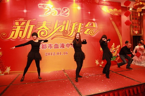 联欢会由职工刘佃雨、李莹和涂丽梅主持,在他们热情洋溢、美好祝福的开场白中,迎新春团拜联欢会正式开始。首先走上舞台表演的是领导班子的歌舞表演《大花轿》,他们穿着红火、喜气的表演服装,亦歌亦舞,一下就把全体职工的眼球吸引了,表演完后他们向职工们致以新春的祝福,祝大家身体健康、家庭幸福、万事如意!随后,以科室为单位表演的文艺节目接连登场,人事科、宣传招募科、储血供血科......,歌曲《欢乐中国年》、舞蹈《幻影时光》、《卓玛》,歌舞《大海航行靠舵手》、京剧《沙家浜智斗》,双簧《散打评书》争先斗艳,舞台剧、扇子舞、广播体操各展风采,从他们的服装、表演,看得出,大家在繁忙的工作之余,还是紧张地作了充分的准备,虽然不是专业的,但是每一个上台的职工都在尽情表演,而正是略显生硬,甚至跑调、变形的动作产生出了不少喜剧效果,引得大家哈哈大笑,掌声、吼叫声、欢笑声不绝于耳,高潮一个接着一个,辛勤、繁忙工作了一年的职工,此时是那么的欢乐、喜悦、放松。