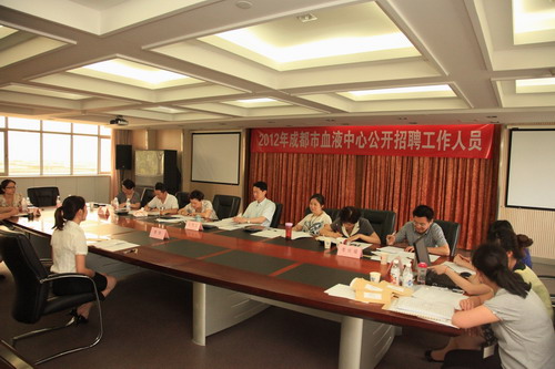 根据成都市人社局的安排部署,按照市卫生局的要求,6月11日中心在六楼大会议室组织开展了“成都市血液中心2012年事业单位公开招聘工作人员面试”考试工作。今年中心拟通过公开招考招聘采供血医生2名,采供血护理3名,经过人社局统一笔试,共有15人进入中心面试环节。