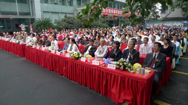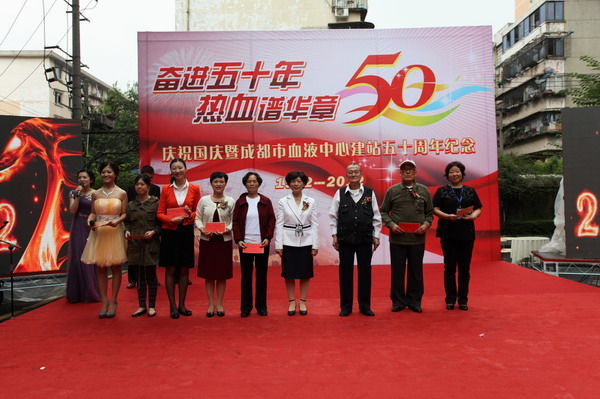 金秋时节,桂花飘香,国庆前夕的血液中心彩旗飘飘、大红气球高高飘扬,上上下下被打扮得喜气洋洋,像过节一样。9月25日下午,中心庆祝建国63周年和中心建站50周年大会在业务大楼前的空坝上隆重举行。参加庆祝大会的有成都市卫生局副局长刘培毅及办公室、医政处等处室负责人,中心历届老领导、离退休职工及全体职工。