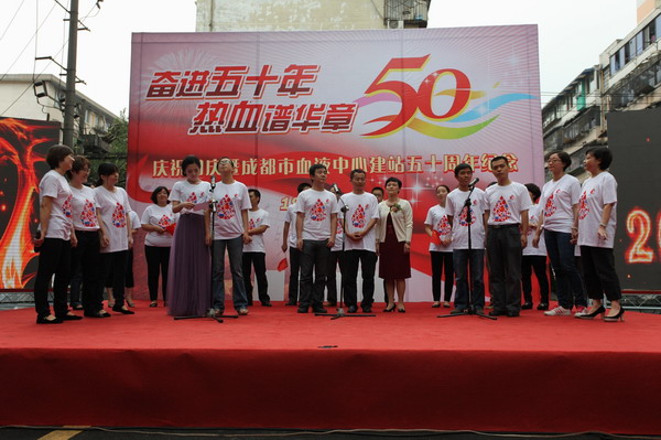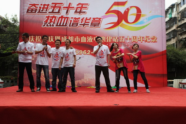 庆祝大会在雄壮的《国歌》声中拉开帷幕,中心党委书记杨群身主持大会,他向大家介绍了参加大会的来宾和庆祝活动的主要内容。随后,播放了中心精心制作的纪录片《热血50年》,该片全面反映和介绍了半个世纪以来中心从无到有、从小到大、从弱到强的发展历程,展示了几代血站人的奋斗史。随后,中心主任王乃红讲话,她代表中心党政班子领导向关心和支持血液中心发展的各级领导,向中心老领导、老同志和全体职工致以崇高的敬意和真诚的感谢。她表示,我们将以建站五十周年为新的起点,为成都市无偿献血事业的发展做出新的、更大的贡献。