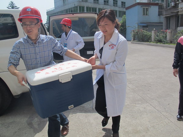 为保证灾区伤员血液救治,在地震发生后立即对血液库存做了分析,与雅安血站取得联系,了解雅安血站的血液需求量,并及时与省卫生厅、成都市卫生局取得联系将相关血液保障情况进行了汇报。下午两点,由中心主任王乃红带队向雅安市中心血站紧急送血,共调拨红细胞悬液358.5单位,血浆37000毫升。同时,向陆军总医院血站调拨红细胞悬液120单位。晚上九点,又向雅安血站调剂RH阴性血4个血型共计8个单位。同时,按照卫生厅的要求,在中午12点前做好了全省血液救援数量统计等调剂工作,全省采供血系统也已经准备好了4000个单位红细胞悬液和65万毫升血浆随时调往灾区。