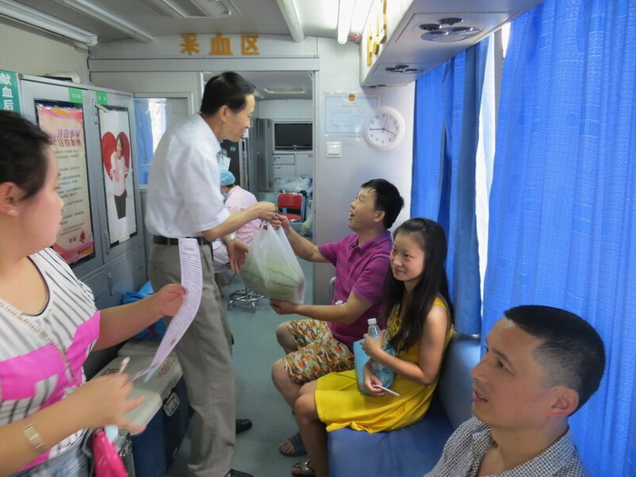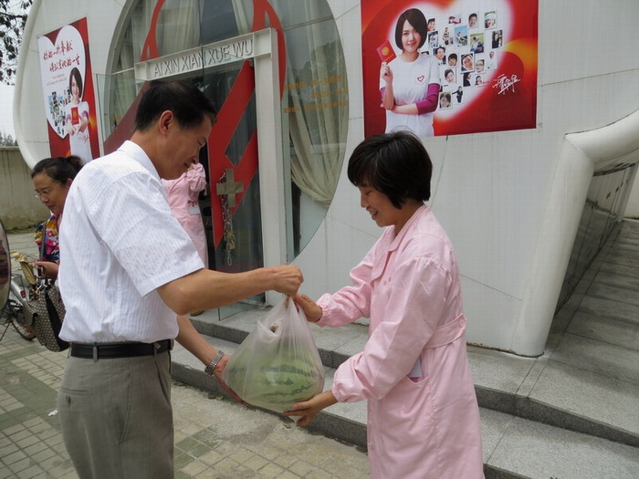 中心领导和工会没有忘记我们一线员工。近日,中心党委书记杨群身、工会主席唐莉等人代表中心领导和全体职工给我们送来了关怀与问候。他们来到位于北新街、双桥子等地的献血车,以及成华、青羊及金牛等献血屋,带来了防暑降温的西瓜和清凉袋泡茶,并叮嘱大家多喝水,做好防暑降温工作。在场的献血者见此场景,也高兴的说:“你们的领导太好了,时刻不忘在外面工作的同志,你们再辛苦也是值得的!”杨书记和唐主席对冒着烈日前来献血的献血者们表示了衷心的感谢,并叮嘱他们献血后要多饮水,注意休息,也要做好防暑降温。