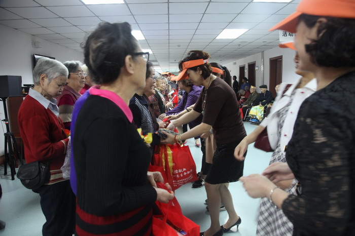 生日会在二福利院和血液中心领导的致词中拉开了帷幕。在简短的致词后,高加良副主任与中心的志愿者们带着爱心与祝福,将准备的礼品送到了老寿星们的手中,志愿者们集体为老人们献上了老革命歌曲“红星闪闪”。一些老人们听到这耳熟能详的老歌,情不自禁的用手或用脚打着节拍跟着一起唱起来。这时,我们看到了老人们脸上洋溢出的幸福笑容,感受到了老人们心中的小小激动,但更多的是体会到了一份沉甸甸的社会责任。最后,我们将带来的慰问品送到了到场的每一位老人手中,同时向老人们送去了国庆节和重阳节的诚挚祝福。