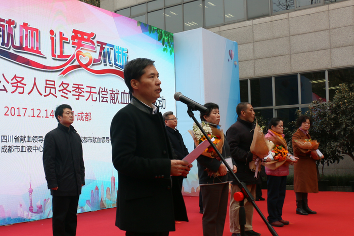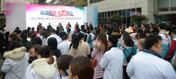 2017年12月14日,由四川省献血领导小组办公室、成都市献血领导小组办公室联合主办,成都市血液中心承办的“定期献血 让爱不断”2017年四川省公务人员冬季无偿献血宣传活动在市血液中心顺利举办。本次活动以倡导“每半年可以捐献一次全血,每14天可以捐献一次血小板”的定期献血理念为主题,省、市献血领导小组成员单位的公务人员及部分医疗卫生单位的医务人员共计300余人参与活动,其中121人成功捐献血液34050毫升。