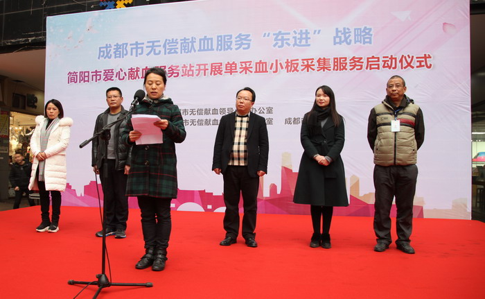 2017年12月29日,由成都市献血领导小组办公室主办、简阳市献血领导小组办公室和成都市血液中心联合承办的简阳市爱心献血服务站开展单采血小板采集服务启动仪式在简阳市成功举行。来自成都市和简阳市献血领导小组成员单位的公务人员及部分医疗卫生单位的医务人员、成都市血液中心的工作人员和来自社会各界的献血者、志愿者共计80余人参加了启动仪式,其中28人成功捐献单采血小板10治疗量、全血6000毫升。
